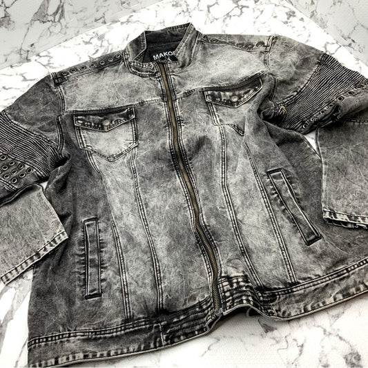 Men's Designer Black Washed Casual Studded Distressed Denim Jacket by Makobi NWT