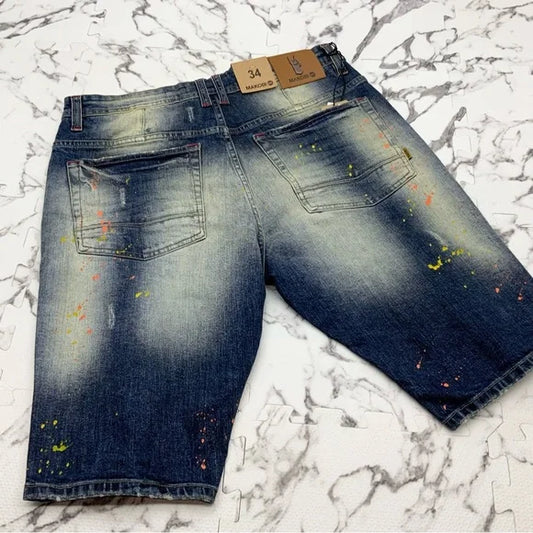 Men’s Makobi Dk Blue Sandblast Ripped Hand-Painted Denim Shorts NWT