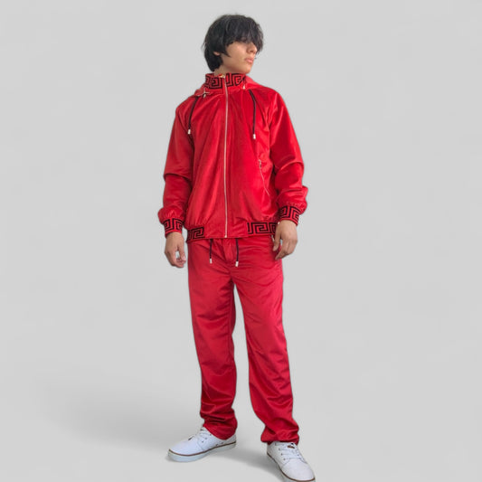 Men’s Manzini Red | Black Velvet Hooded Casual Tracksuit Outfits Sets NWT