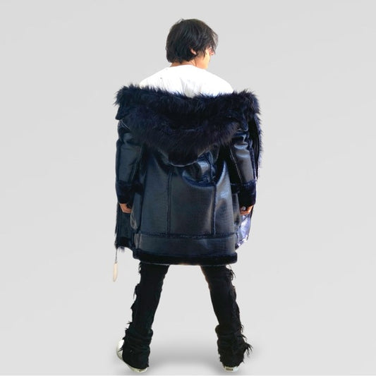 Men’s Navy Crocodile Print Hooded Vegan Leather & Faux Fur Jacket NWT