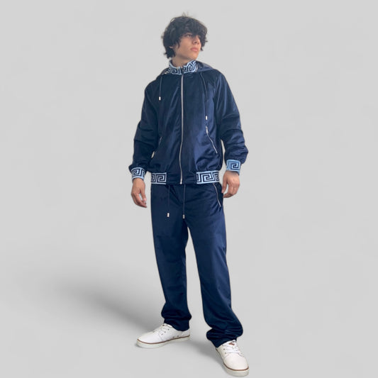Men's Manzini Navy | Sky Blue Hooded Velvet Casual Tracksuit Outfits Sets NWT