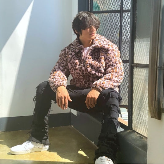Men's Manzini Pink | Brown Leopard Faux Fur Fuzzy Casual Coat NWT