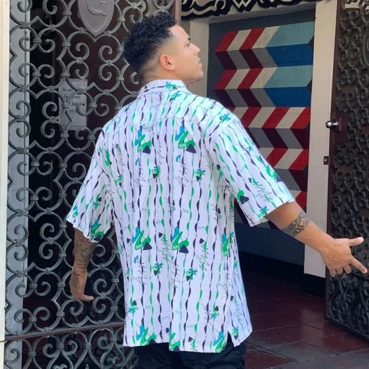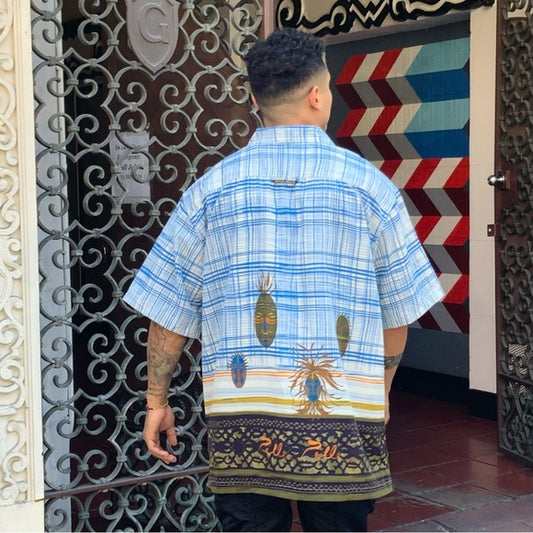Men's Pelle Pelle White | Sky Blue | Green African Art Button Down Shirt NWT
