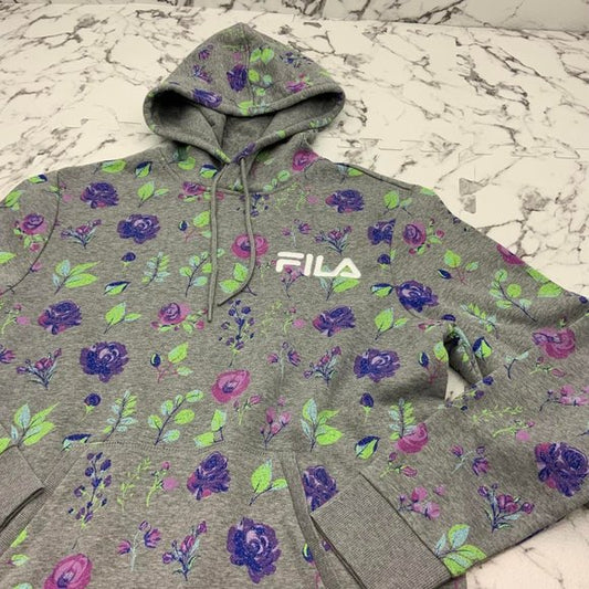 Men's Fila Heather Grey Allover Print Pullover Fleece Hoodie NWT