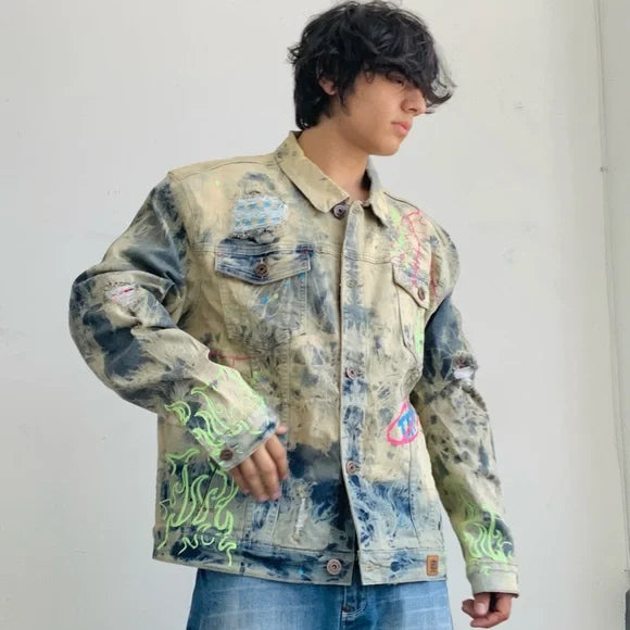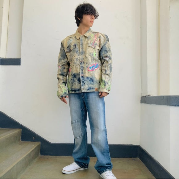 Men’s Distressed Blue Dirty Wash Full Zip Denim Jacket by Makobi NWT